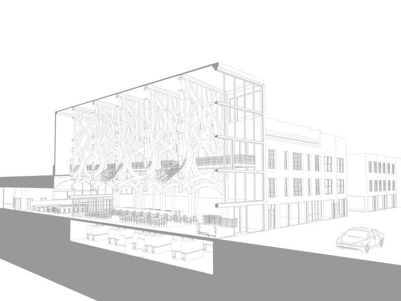 The two trees create unity by forming a circle at the centre. I extruded one of the arches through the site to get the correct form. This allows the arch to be seen from Lower Marsh and makes the space more open and bright.
